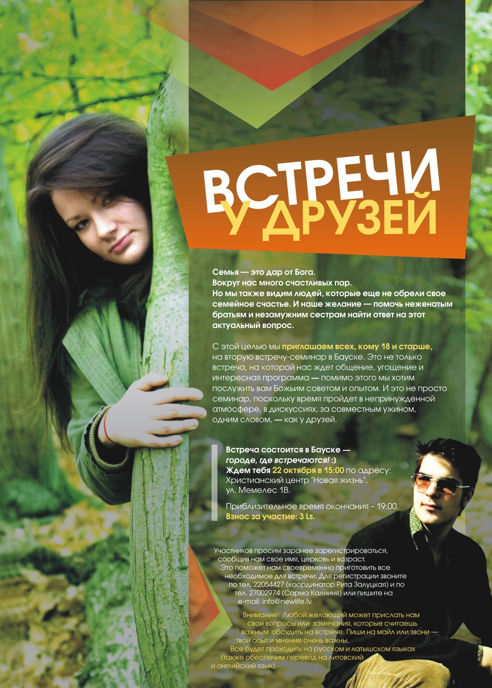 В церкви «Новая Жизнь» г. Бауска, где служит пастором Андрей Залуцкий, пройдет встреча-семинар для незамужних и неженатых под названием «Встреча у друзей». В субботу, 22 октября 2011, начало в 15.00, приблизительное окончание в 19.00.